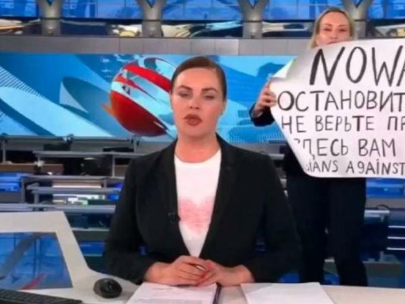 Rus Kanal 1'de akşam haberlerinin yayınlandığı sırada haber editörü eline bir pankart alarak spiker Ekaterina Andreeva'nın arkasına geçmiş ve "Savaşa hayır. Propagandaya inanmayın. Size burada yalan söylüyorlar” yazılı pankart açıp “Savaşı durdurun” diye bağırması sonrası canlı yayın kesilmişti.