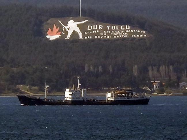 Kilitbahir köyü dağında bulunan 'Dur Yolcu' yazısı ile Kilitbahir Kalesinin önünden geçen askeri tanker, Ege Denizine doğru yol aldı.