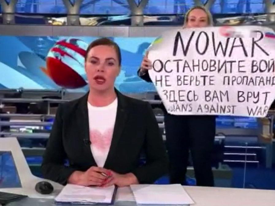 Rusya’nın federal televizyon kanallarından Perviy'de akşam haberlerinin yayınlandığı sırada haber editörü Marina Ovsyannikova, elinde pankartla spiker Ekaterina Andreeva'nın arkasında kameraların karşısına çıktı.