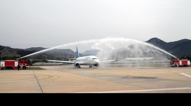 GAZİPAŞA- Alanya Havalimanı'na Rus turist kafilesini getiren uçak, itfaiye araçlarının su takıyla karşılandı. Uçaktan inen turistlere de çiçek ve çilek verildi.