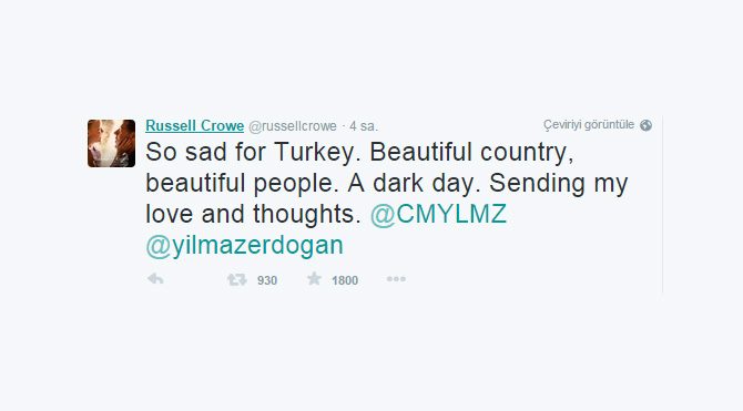 Türkiye'ye bir taziye de dünyaca ünlü oyuncu Russel Crowe'dan geldi. Yeni Zelandalı oyuncu Twitter hesabından mesaj yayınladı.