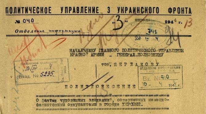 II. Dünya Savaşı sırasında, Sovyetler Birliği’nin Üçüncü Ukrayna Cephesi Komutanı General Mihail Rudakov’un, Kızıl Ordu Politik İdaresi Müdürü General Aleksandr Şerbakov’a sunduğu 3 Nisan 1944 tarihli raporda, o dönemde Herson bölgesinde on binlerce sivil Ukraynalının işkence görerek infaz edildiklerinin bildirildiği görülüyor.