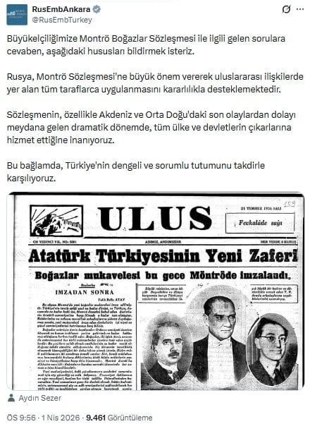 Rusya, Montrö Sözleşmesi'ne büyük önem vererek uluslararası ilişkilerde yer alan tüm taraflarca uygulanmasını kararlılıkla desteklemektedir.