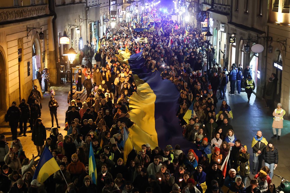 Polonya'nın Krakow kentinde, savaşta hayatını kaybedenler anıldı ve Ukrayna'ya destek gösterisi düzenlendi. Göstericiler, Krakow'daki Rus Konsolosluğu dışında toplandı.