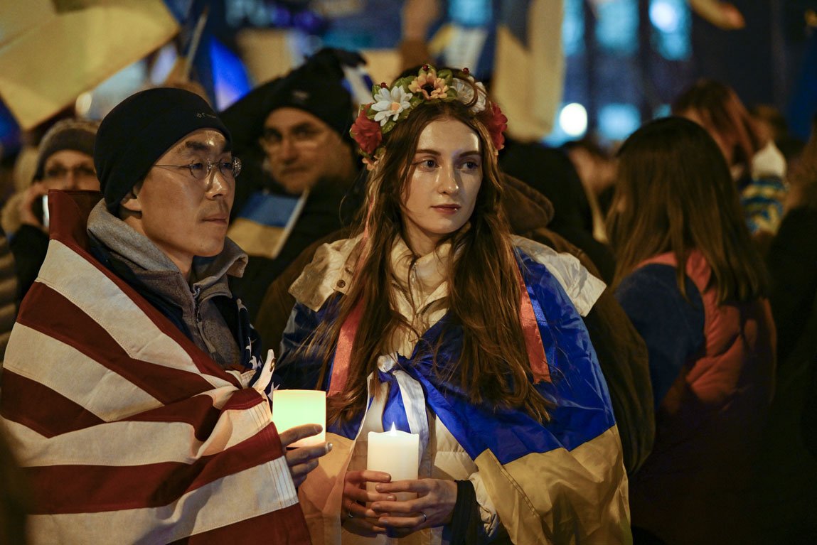 ABD’nin başkenti Washington’da bulunan Rusya Büyükelçiliği önünde, Ukrayna-Rusya Savaşı için toplanıldı. Rusya Büyükelçiliği binasına Ukrayna bayrağı yansıtıldı. Gösteride mumlar yakıldı, savaşta hayatını kaybedenler anıldı.