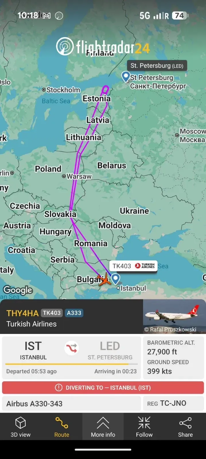 Türk Hava Yolları’nın TK403 sefer sayılı Rusya hattında görev yapan uçağı, güvenlik riski nedeniyle St. Petersburg’da hava limanına iniş gerçekleştiremeyerek İstanbul’a dönüş yaptı.