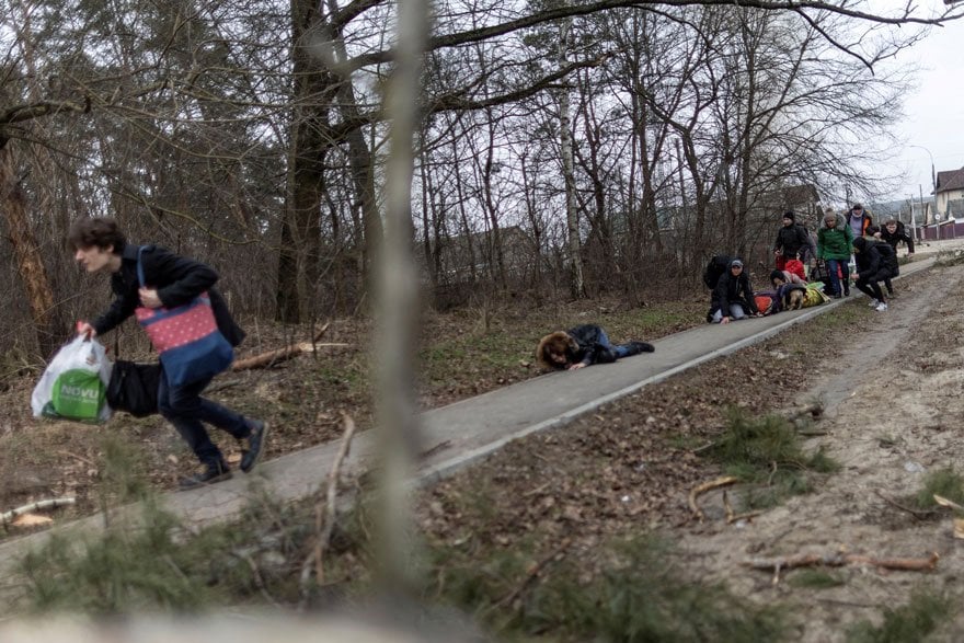 Kiev yakınlarındaki Irpin'de bölgeden kaçmak isteyen sivillere düzenlenen saldırı anları kameralara böyle yansımıştı.