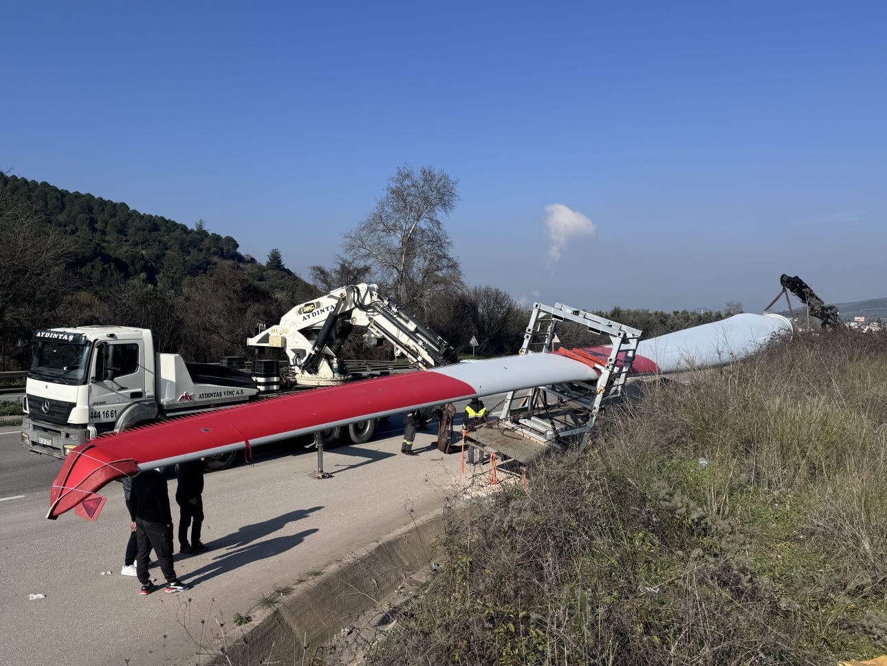 İzmir'den Gemport Limanı'na rüzgar türbininin kanadını taşıyan tır, Gemlik ilçesi yakınlarında kontrolden çıkarak yol kenarındaki yağmur suyu kanalına düştü. Tırın yaklaşık 70 metrelik rüzgar türbininin kanadını taşıyan dorse kısmı kanalda kalırken, çeker kısmı yolda kaldı.