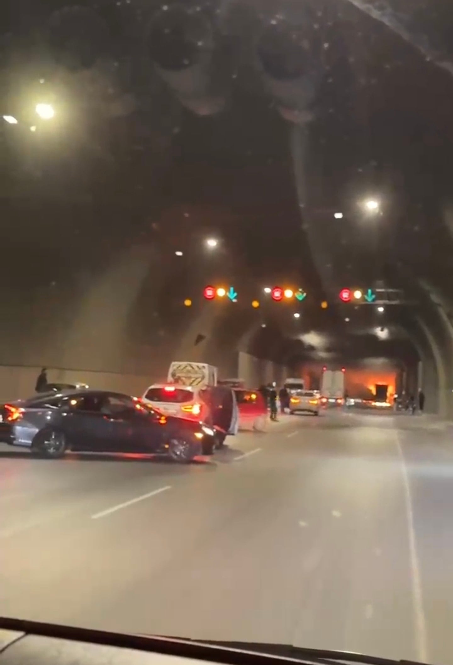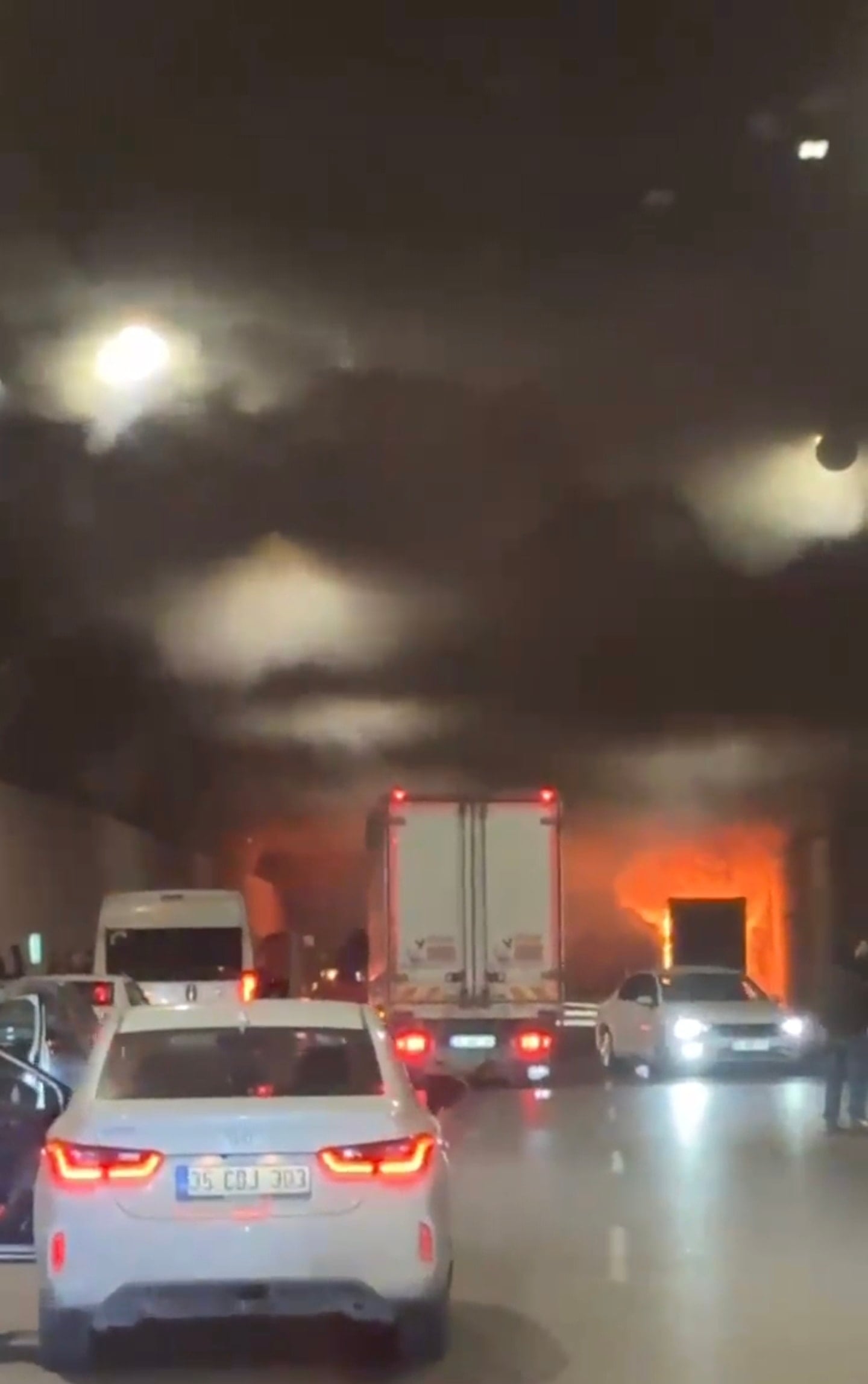 Alev alev yanan kamyonetten yükselen yoğun duman nedeniyle tünelde görüş mesafesi düştü.
