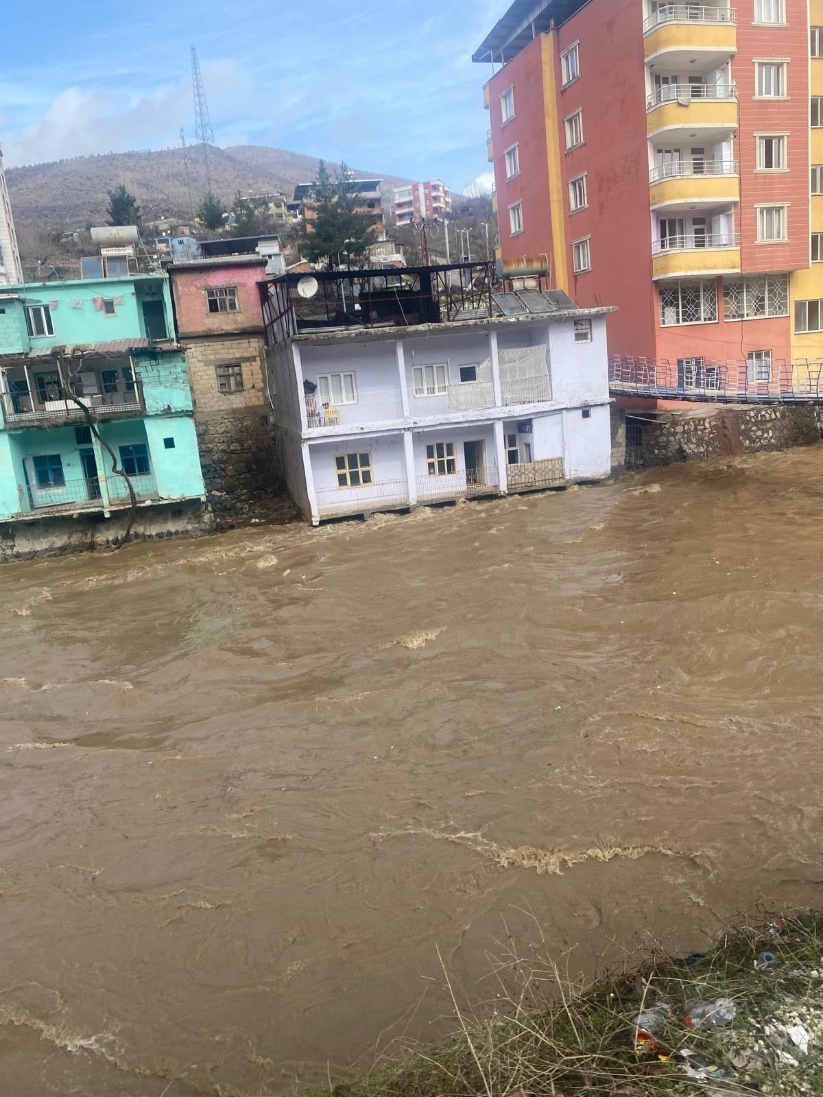 Su, derenin kıyısındaki binaların balkon seviyelerine ulaştı. O anlar cep telefonu kamerasıyla görüntülendi.