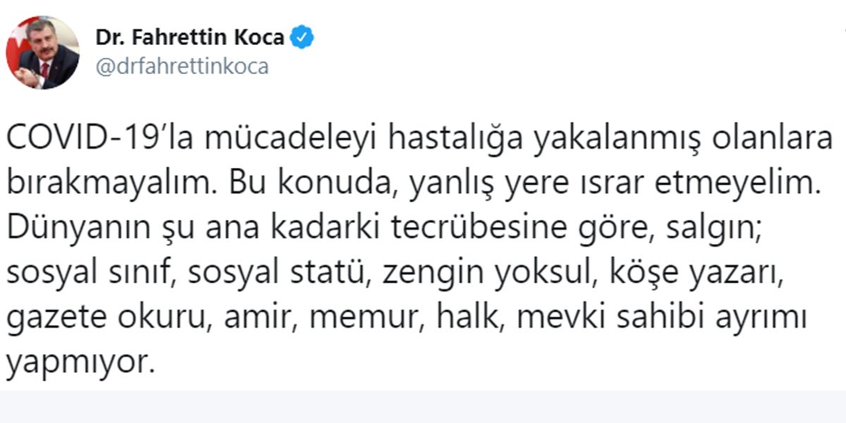 Koca, Twitter hesabından yaptığı paylaşımlarda uyarılar yapmaya devam ediyor. "COVID-19’la mücadeleyi hastalığa yakalanmış olanlara bırakmayalım." diyerek coronanın sosyal sınıf ayrımı yapmadığını vurguladı: