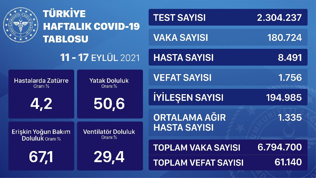 18-24 Eylül tarihlerine ait tabloda, iyileşen sayısı ve vefat sayısında düşüş yaşandığı görüldü. 11-17 Eylül tarihlerinde, bin 756 olan vefat sayısı bin 605'e, 194 bin 985 olan iyileşen sayısı da 167 bin 314'e düştü.