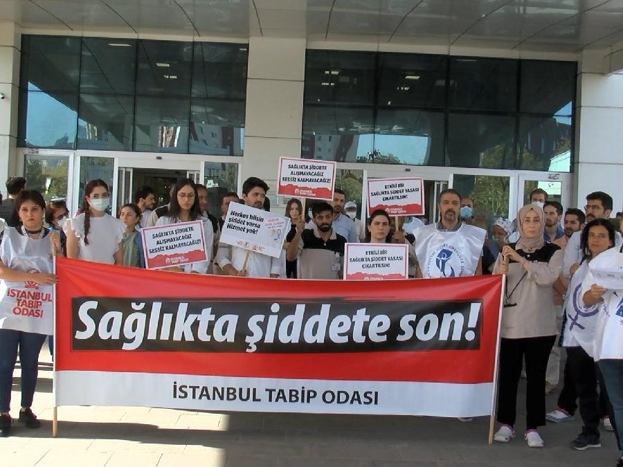 'Sağlıkta şiddete son' pankartı açan sağlık çalışanları okunan basın açıklamasının ardından, İstanbul Esenyurt Devlet Hastanesi acil serviste sessiz olmaları konusunda uyardığı hasta yakınları tarafından uğradığı bıçaklı saldırı sonucu yaşamını yitiren güvenlik görevlisi Tuğrul Okutan için saygı duruşunda bulundu.