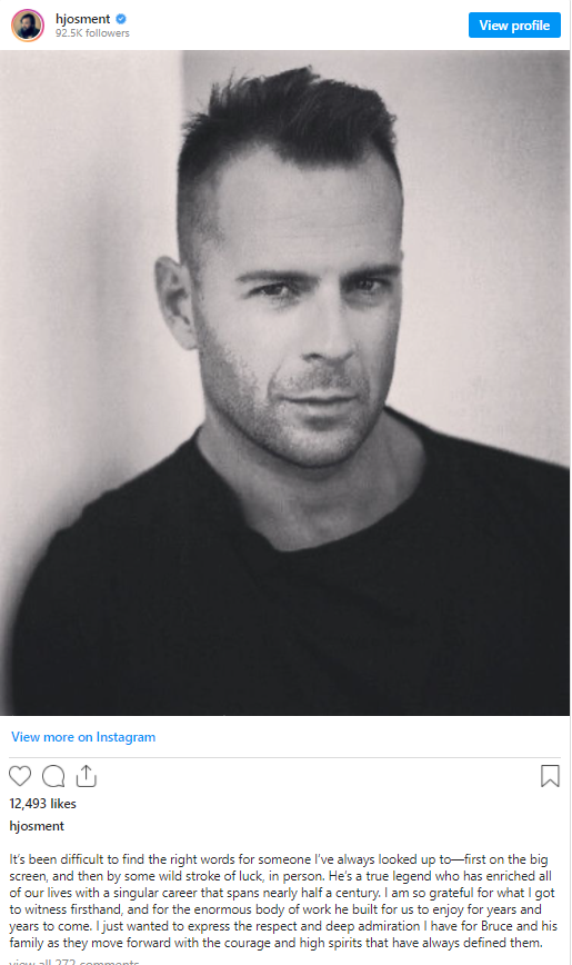 "Her zaman hayranlıkla baktığım biri için doğru kelimeleri bulmak zor oldu. Önce büyük ekranda gördüğüm, sonra da şans eseri şahsen beraber oynadığım bir oyuncuydu. O, neredeyse yarım yüzyıla yayılan bir kariyerle tüm hayatımızı zenginleştiren gerçek bir efsane. İlk elden tanık olduklarım ve gelecek yıllar boyunca zevk almamız için inşa ettiği muazzam işler için çok minnettarım. Bruce ve ailesi, onları her zaman tanımlayan cesaret ve yüksek ruhla ilerlerken onlara duyduğum saygıyı ve derin hayranlığı ifade etmek istedim."