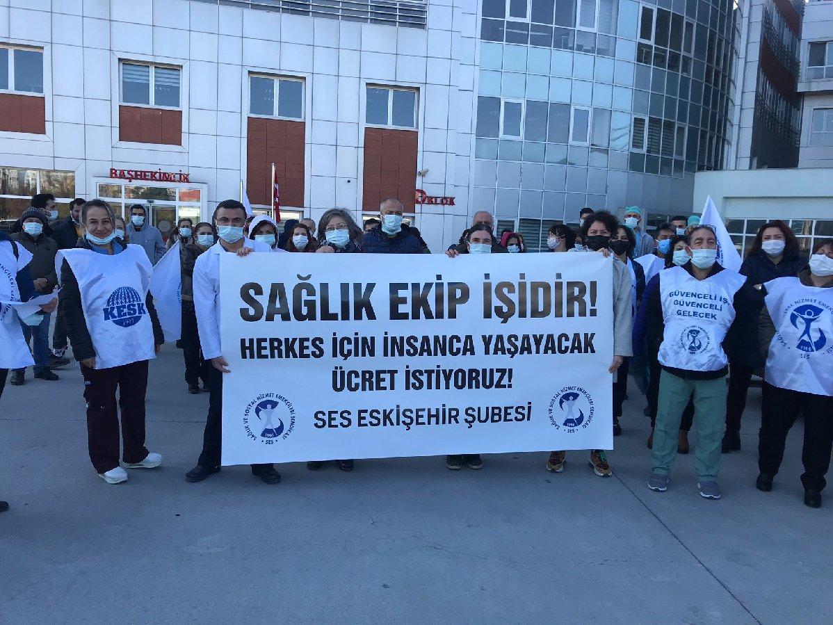 Eskişehir'de hükümet yanlısı olarak bilinen Sağlık-Sen üyeleri ile SES üyeleri Yunusemre Devlet Hastanesi önünde ayrı ayrı eylem yaptı. Eylemler arasında 15 dakikalık fark olmasına rağmen talepler ve tepkiler aynıydı. Sağlık-Sen üyeleri, sağlıkçılar arasında yapılan ekonomik ayrımcılığa tepki gösterdi. Eyleme katılanlar, 'Ayçiçek yağı kadar zam istiyoruz', 'Hepimiz döner sermaye mağduruyuz', 'Lütuf değil maaşta adalet istiyoruz' şeklinde pankar açtı.