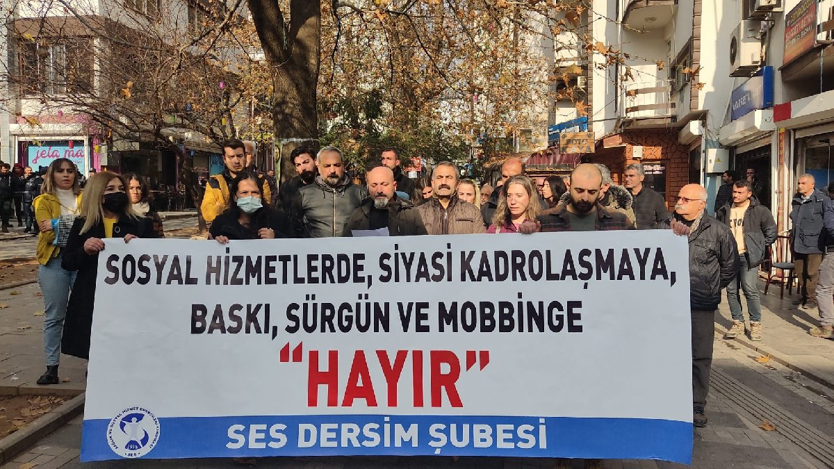 ‘Sosyal Hizmetlerde, siyasi kadrolaşmaya, baskı sürgün ve mobbinge hayır’ pankartı önünde açıklama yapan SES Tunceli Şube Eş Başkanı Kahraman Yürük, sosyal hizmet çalışanlarının sorunlarının gün geçtikçe arttığını belirtti.