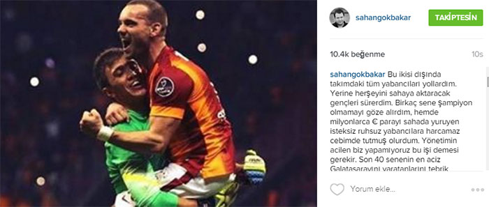 "Bu ikisi dışında takımdaki tüm yabancıları yollardım. Yerine herşeyini sahaya aktaracak gençleri sürerdim. Birkaç sene şampiyon olmamayı göze alırdım, hemde milyonlarca € parayı sahada yuruyen isteksiz ruhsuz yabancılara harcamaz cebimde tutmuş olurdum. Yönetimin acilen biz yapamıyoruz bu işi demesi gerekir. Son 40 senenin en aciz Galatasarayını yaratanlarını tebrik ederim!!!! Not: Sabri ve Yasin 1234"