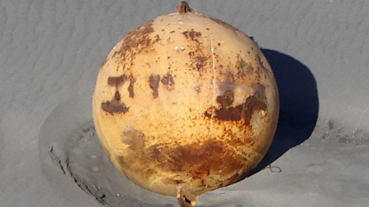 Japon yayın kuruluşu NHK, Enshuhama Sahili'nde yaklaşık 1,5 metre genişliğinde görünen paslı, metal küreye bakan iki yetkilinin görüntülerini paylaştı.