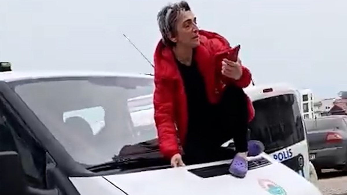 İhbar üzerine bölgeye polis ekipleri sevk edildi. İkna edilen kadın aracın üzerinden indirildi. Kadının eylemi, olay yerindeki vatandaşlar tarafından cep telefonu kamerasıyla kaydedildi.