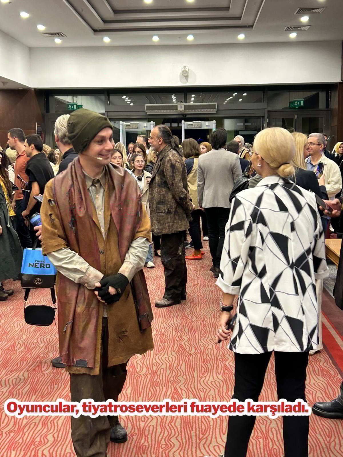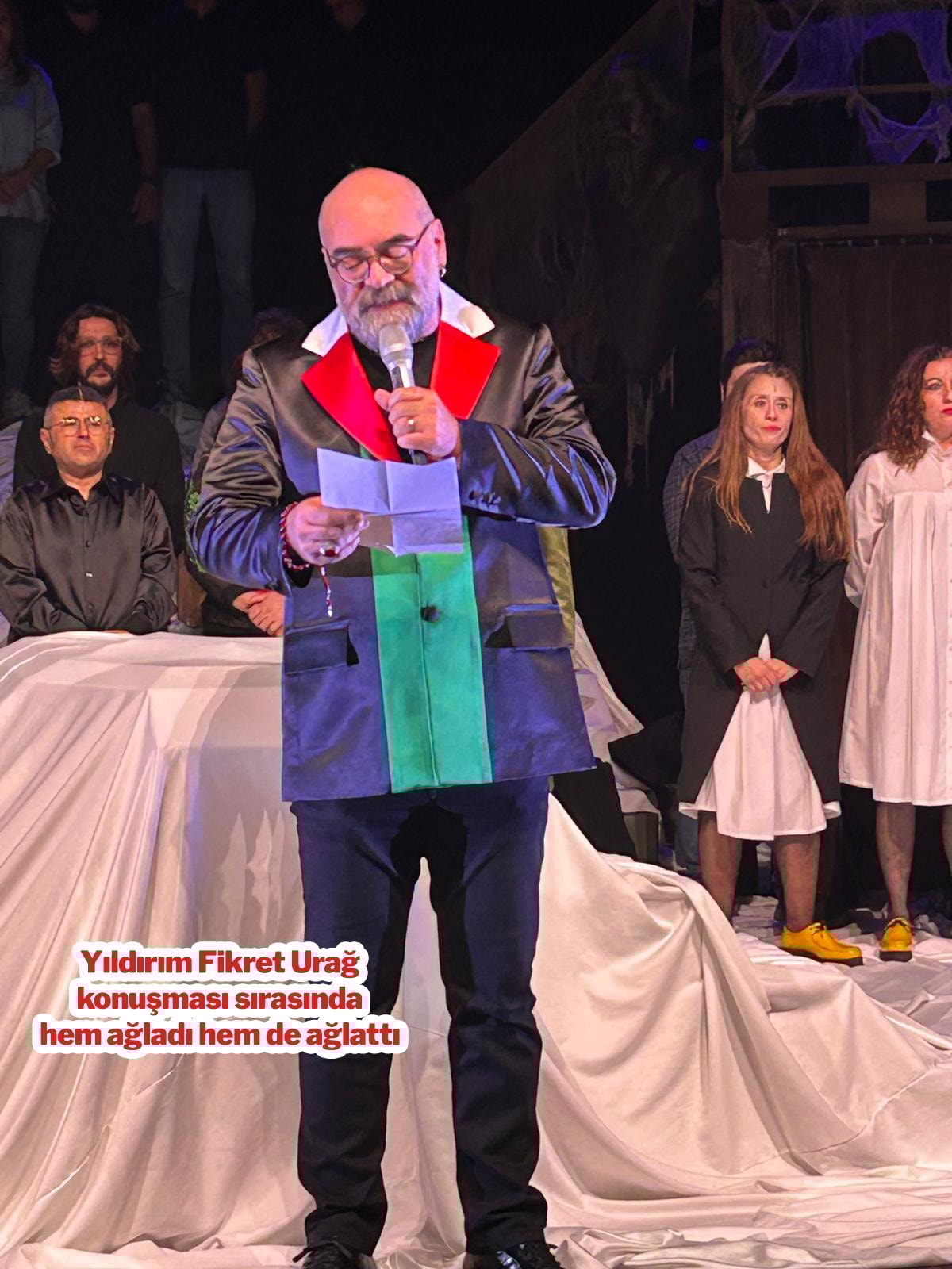 Oyunun ardından sahneye Filistin bayrağının renklerinden oluşan bir takım elbiseyle çıkan yönetmen Yıldırım Fikret Urağ, Gazze’deki soykırıma dikkat çekti. Konuşma sırasında gözyaşlarına hakim olamayan Urağ, oyuncuları ve seyirciyi de ağlattı.
