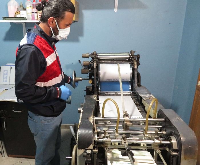 Yapılan araştırma ve fiziki takip neticesinde, 5 kişinin resmi belgede sahtecilik suçlarından hakkında işlem yapılan kişilerle sık sık bir araya geldiği, sahte çek, kimlik ve pasaport basımında kullanılan malzeme temin ettikleri belirlendi. Gerekli hazırlıkları yapan jandarma ekipleri iş yerine operasyon yaptı.