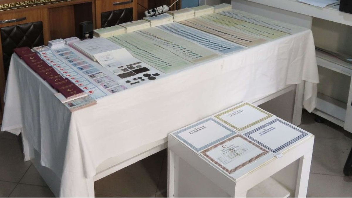 Operasyonda İ.İ., İ.İ., K.K., Y.K. ve A.S. isimli kişiler gözaltına alındı. İş yerinde yapılan aramada çeşitli bankalara ait, şirketler ve şahıslar adına düzenlenmiş bin 500 sahte çek, 12 bin çeşitli bankalara ait içi boş sahte çek yaprağı, 750 eski tip sahte nüfus cüzdanı, 600 yeni tip kimlik basımında kullanılan çipli boş kart, 800 adet yeni tip sürücü belgesi basımında kullanılan çipsiz boş kart, 8 adet sahte Türkiye Cumhuriyeti Pasaport Defteri, 34 adet sahte yeni tip kimlik kartı, 10 adet sahte sürücü belgesi, 1 adet matbaa makinası, 1 adet soğuk mühür makinası, 1 adet kart kesme makinası, 1 adet kart basma makinası, 2 adet dizüstü bilgisayar ve yazıcı düzeneği ile sahte çek, sahte kimlik ve sahte pasaport basımında kullanılan çok sayıda malzeme ele geçirildi.