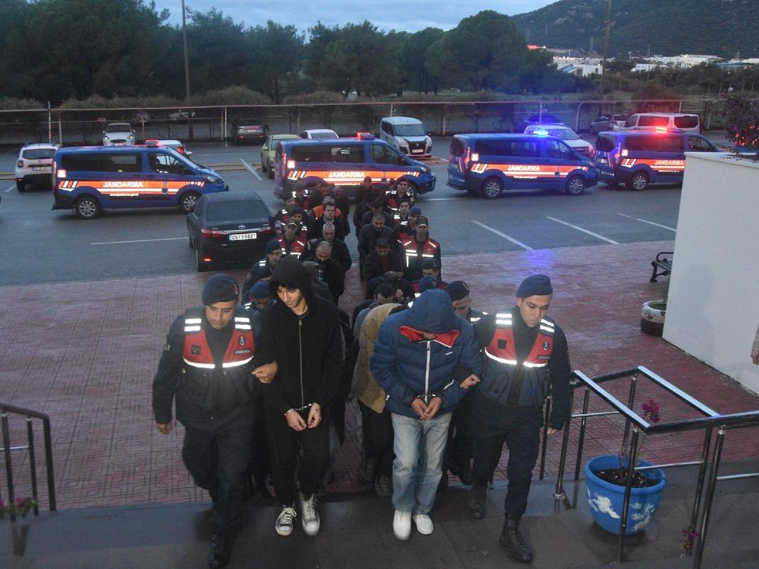 Eş zamanlı baskınlarda gözaltına alınan 25 şüpheli, Muğla'ya getirildi. Jandarmada işlemleri tamamlanan 25 şüpheli, sabah saatlerinde adliyeye sevk edildi. (DHA)