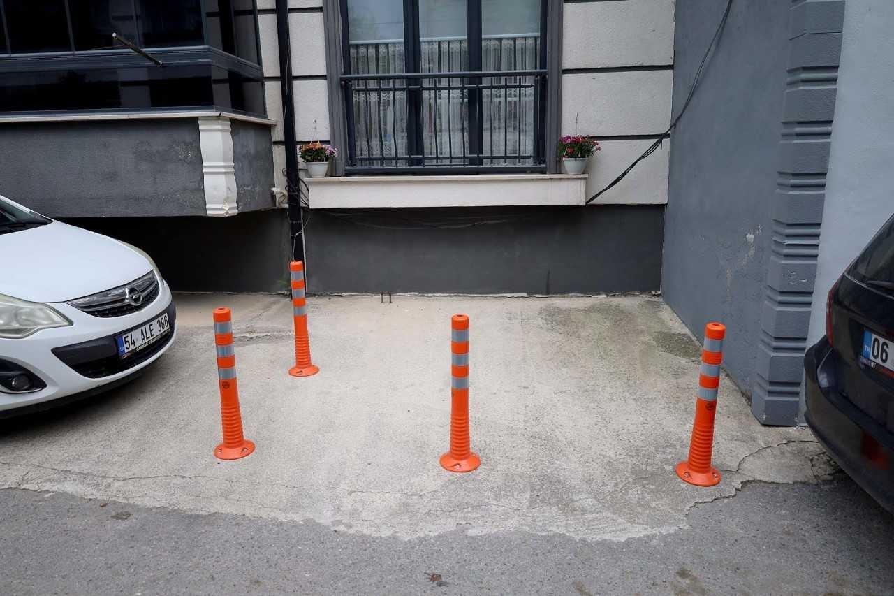 Ekipler tarafından pencerenin önüne araç parkını engellemek amacıyla plastik dubalar monte edildi.