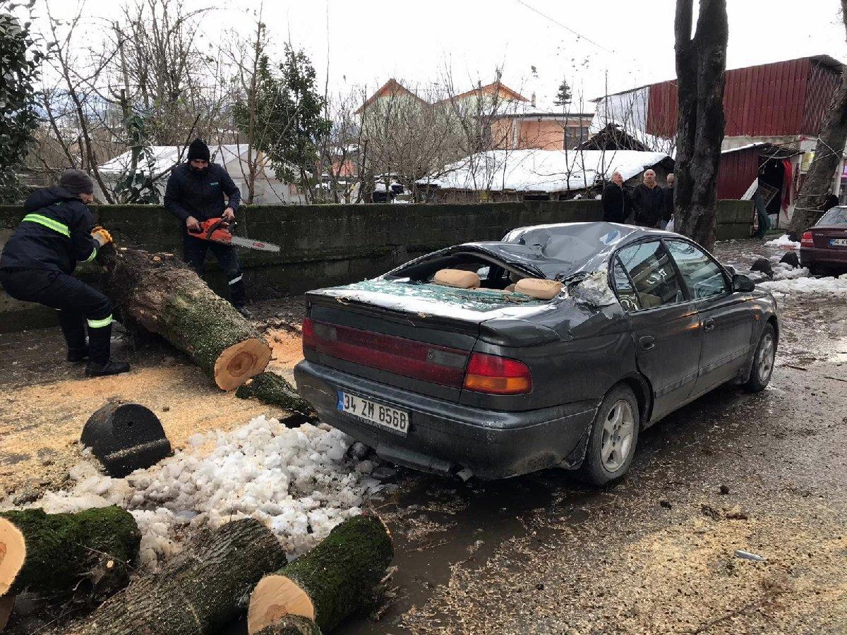 Gece saatlerinde etkisini arttıran şiddetli rüzgar yüzünden Hendek ilçesi Osman Yılmaz Caddesi'nde park halinde bulunan Dilek Uzan'a ait 34 ZM 8568 plakalı aracın üzerine yol kenarındaki ağaç devrildi.