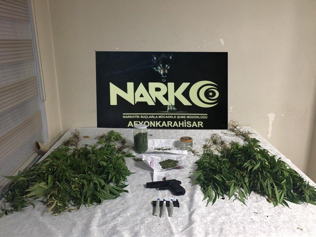 Afyonkarahisar'da kaldıkları evdeki saksıda kenevir yetiştiren ve bir belediyede zabıta olarak görev yapan şahıs ile arkadaşı gözaltına alındı.