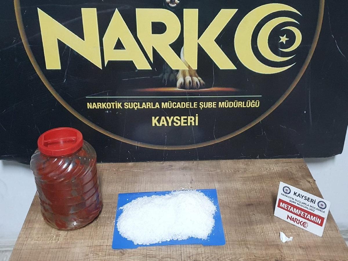 Kayseri'de polis ekipleri tarafından uyuşturucu operasyonunda bidonun içerisindeki salçanın içine zulalanmış uyuşturucu madde ele geçirildi.
