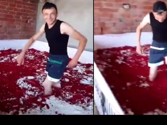 Balıkesir'de salça üretimi yapan özel bir tesiste bir çalışan salça ile tuz bulunan havuza çıplak ayaklarıyla girdi.