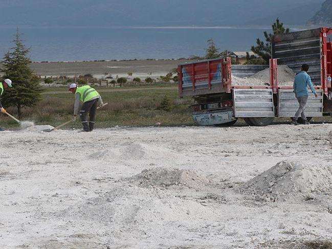 Burdur'daki Salda Gölü'nde iş makinesi ve kamyonlarla başka bir alana taşınan kumlar, yeniden eski yerine götürülmeye başlandı. Bu kez iş makinesi kullanılmadı.