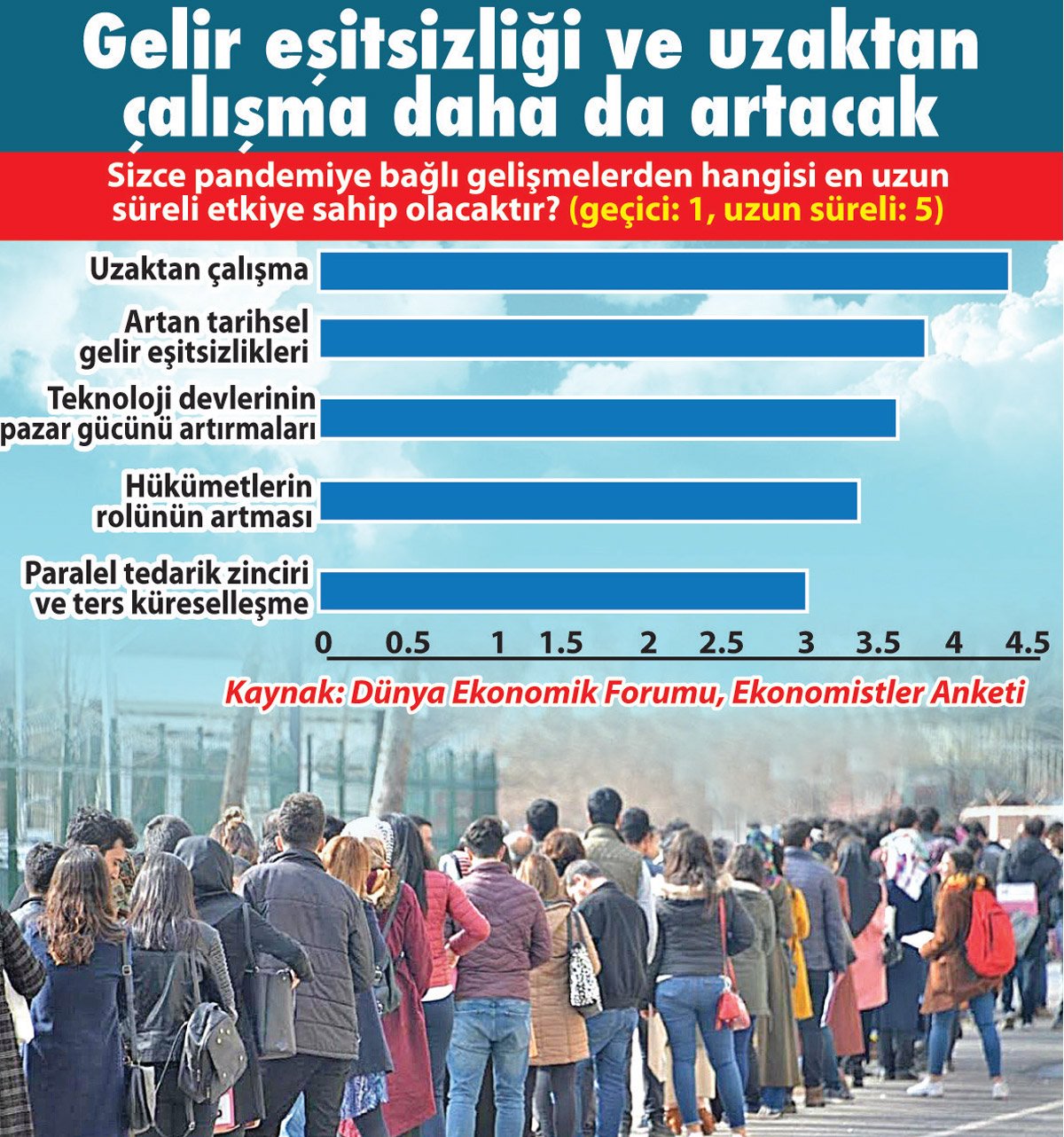 Ekonomistler, pandemiye bağlı etkisi en yüksek olan gelişmeyi uzaktan çalışmanın kalıcı hale gelmesi olarak belirlediler. Onu gelir dağılımında daha derin eşitsizlik, teknoloji devlerinin pazar paylarını artırmaları, hükümetlerin rolünün daha da artması ve paralel tedarik zincirleriyle birlikte ters küreselleşme izliyor. Raporda kısıtlamalar ve işyeri kapanmaları dijitalleşmeyi artırdığı için yüz yüze faaliyette bulunan işletmelerin büyük zarar gördüğüne dikkat çekilerek, geçen yılın sonunda en değerli beş şirketin hepsinin teknoloji faaliyeti yürüttüğü hatırlatıldı. Bu gelişme, Avrupa ülkelerinin teknoloji devlerine vergi getirme iştahını da artırmış görünüyor. Dün Almanya Maliye Bakanı Olaf Scholz, bu yaz Ekonomik İşbirliği ve Kalkınma Teşkilatı (OECD) oran belirlemeden önce vergiye geçilebileceği mesajını verdi.