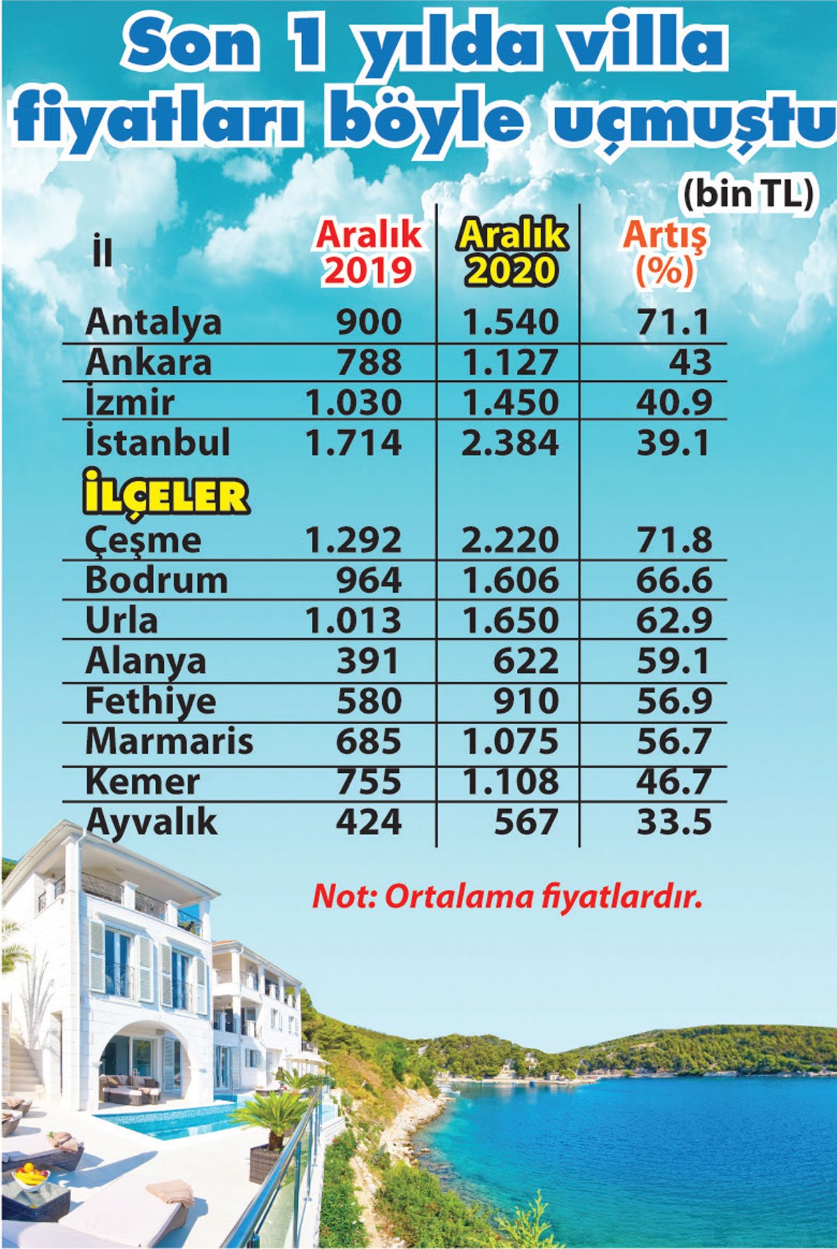 Taşçı, 2020 Aralık ayında geçen yılın aynı dönemine göre Çeşme, Bodrum, Urla, Alanya, Marmaris, Fethiye, Kemer ve Ayvalık’taki 2+1 yazlık fiyatlarının yüzde 33.5 ila yüzde 71.8 oranında arttığını belirtirken, “Fiyatlar artık zirveye ulaştı. Aşının etkisiyle ‘uçan villalarda’ ciddi düşüşler yaşanacağının sinyalleri gelmeye başladı. Fiyat düşüşünün bölgelere göre değişmekle birlikte yüzde 35 ila yüzde 50’leri bulacağını tahmin ediyoruz. Pandemi villalarında alış döneminin bittiğini, satış döneminin başladığını söyleyebiliriz” dedi.