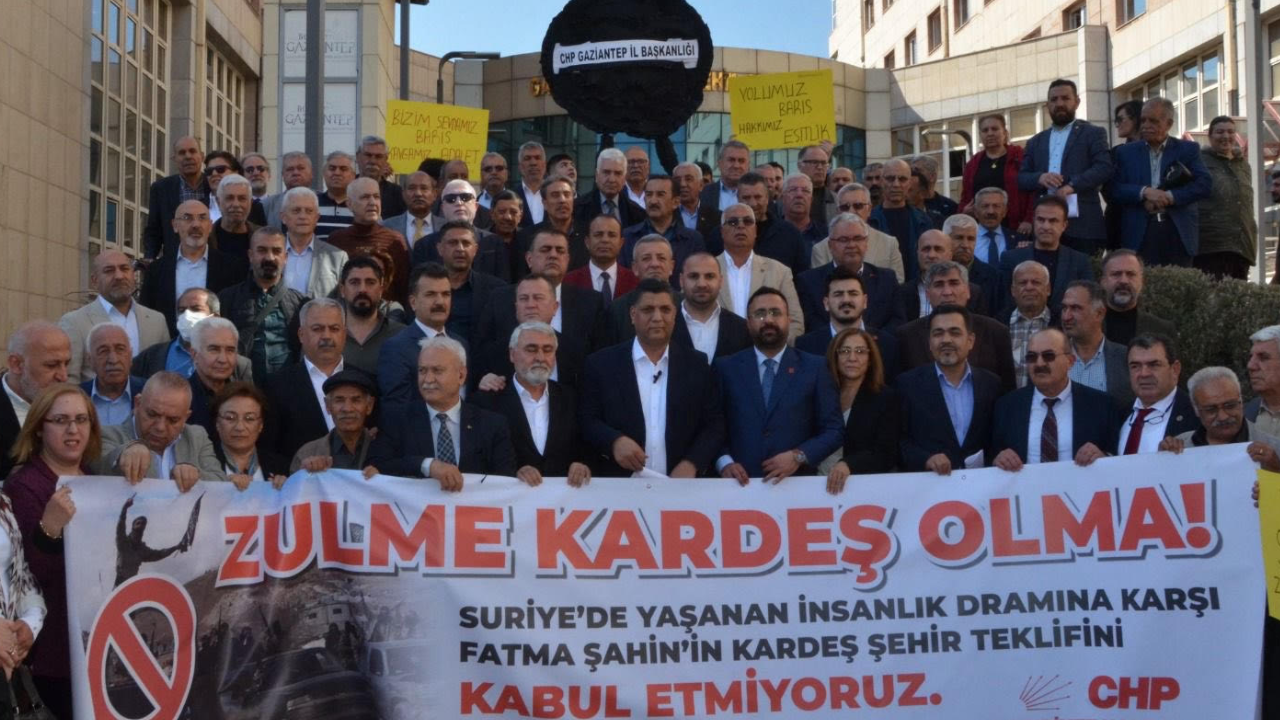 CHP Gaziantep İl Başkanı Reis Reisoğlu, partililerle birlikte Gaziantep Büyükşehir Belediyesi önüne gitti. Büyükşehir yönetiminin Şam ve Halep’i kardeş şehir ilan etmesine tepki göstermek amacıyla belediye binası önünde basın açıklaması düzenledi. Açıklama sonrasında CHP İl Başkanı Reisoğlu ve partililerin belediye önüne siyah çelenk bırakmak istemesi üzerine güvenlik güçleri müdahalede bulundu. Kısa süreli gerginliğin ardından çelenk, belediye binası önüne bırakıldı.
