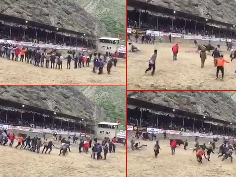 Artvin'de düzenlenen geleneksel ödüllü boğa güreşlerinde şampiyon olan boğa, etrafında horon oynayanları kovaladı. O anlar kameraya yansıdı.