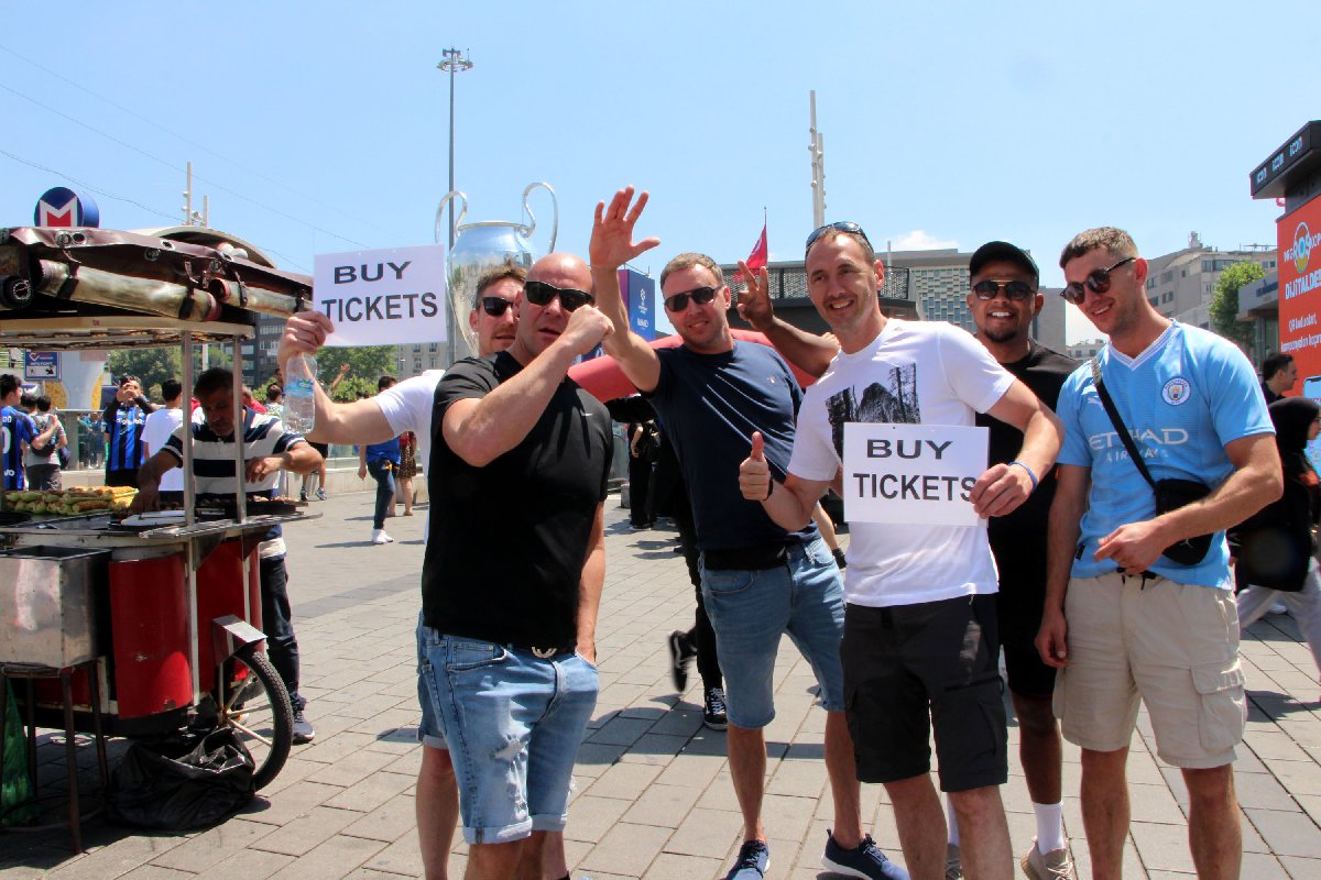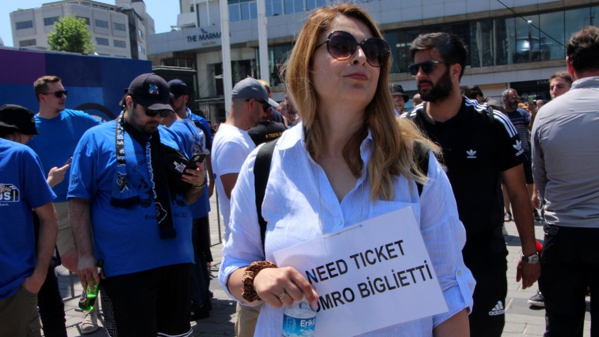 Taksim Meydanı'nda final maçı için bilet bulmaya çalışan bazı taraftarlar ilginç yollara başvurdu. Ellerinde ve boyunlarında 'Bilete ihtiyacım var' yazıları taşıyan taraftarlar maç için bilet arayışına geçti.