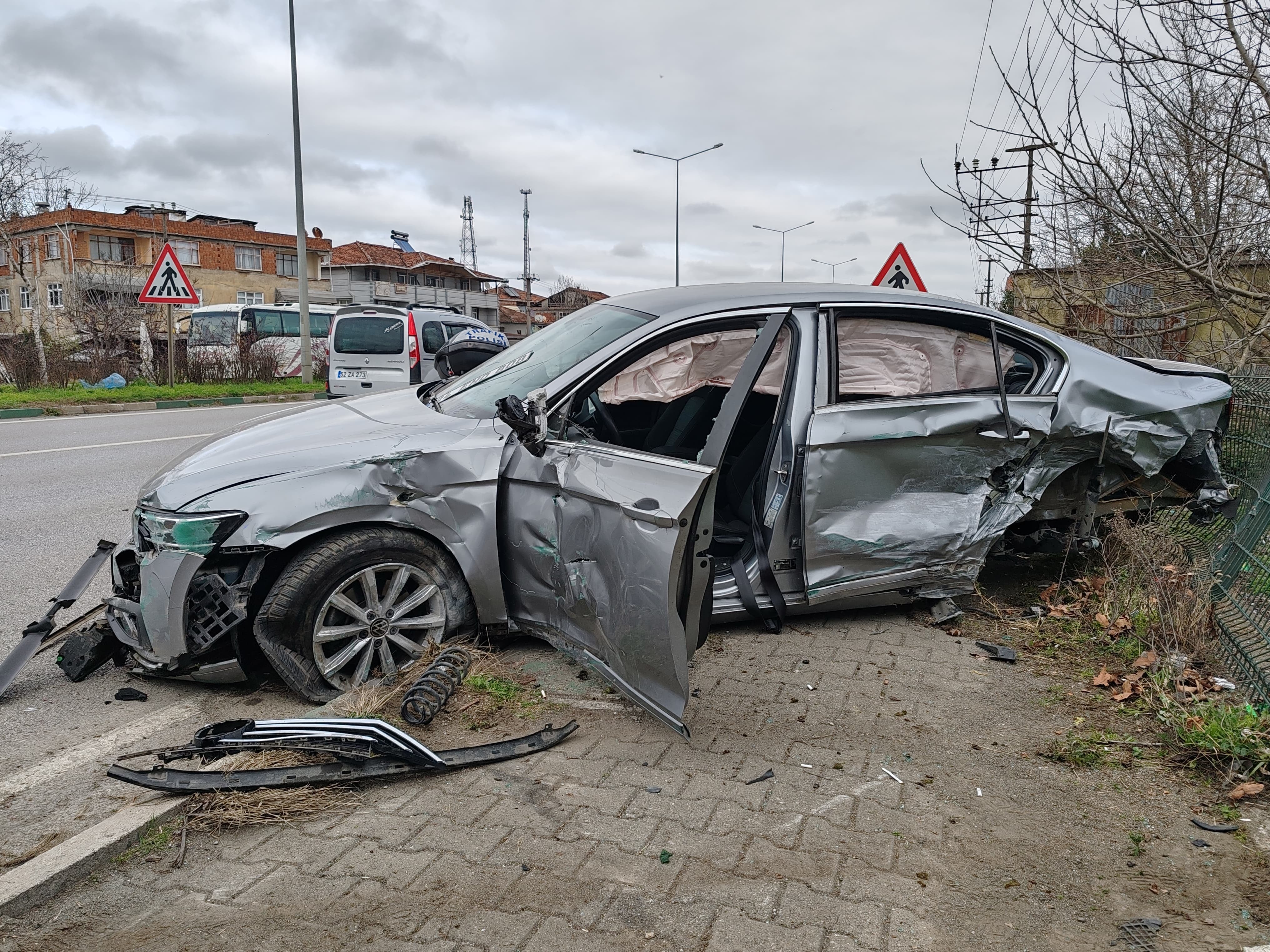 Hafif ticari araç daha sonra yol kenarındaki beton elektrik direğine çarparak durabildi.