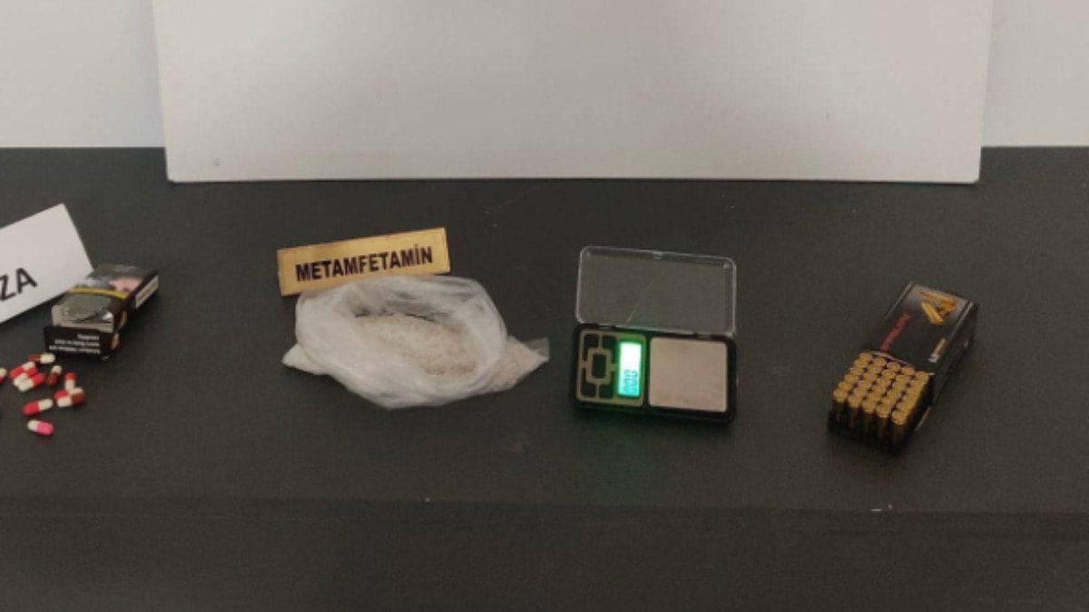 Adreste arama yapan ekipler, 120,60 gram sentetik uyuşturucu, 12 sentetik ecza hapı, 1 hassas terazi ve 30 adet tabanca fişeği ele geçirdi.