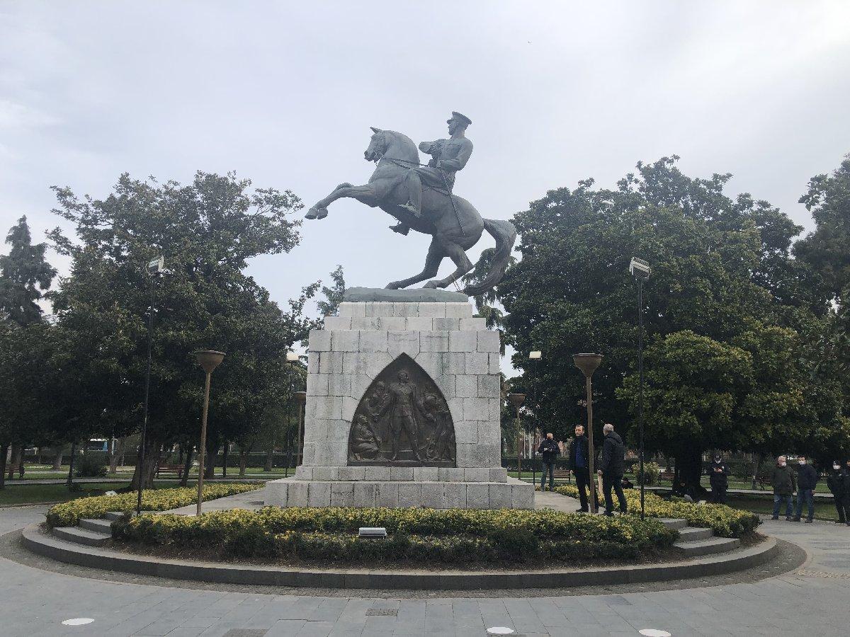 Onur anıtı olarak bilinen ve milli törenlerin düzenlendiği Atatürk anıtına dün akşam kimliği belirsiz kişi ya da kişiler tarafından saldırı yapıldı. Saldırganlar, Atatürk’ün üzerinde bulunduğu atın arka bacaklarına ip bağlayıp çekerek yıkmaya çalıştı.