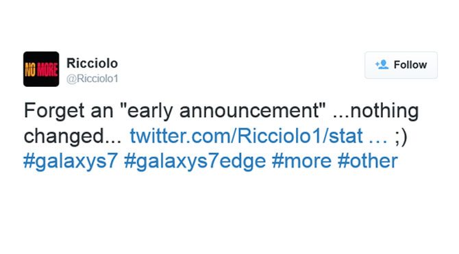 Sızıntı kaynağı @Ricciolo1’in attığı tweet ve çeşitli söylentiler, Samsung Galaxy S7’nin tanıtımının, Barcelona'da düzenlenecek olan MWC etkinliğinde gerçekleşeceğini gösteriyor.