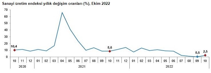 Sanayinin alt sektörleri (2015=100 referans yıllı) incelendiğinde, 2022 yılı Ekim ayında madencilik ve taşocakçılığı sektörü endeksi bir önceki yılın aynı ayına göre yüzde 7,4 azaldı, imalat sanayi sektörü endeksi yüzde 3,7 arttı ve elektrik, gaz, buhar ve iklimlendirme üretimi ve dağıtımı sektörü endeksi yüzde 4,8 azaldı.