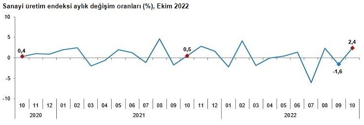 Sanayinin alt sektörleri incelendiğinde, 2022 yılı Ekim ayında madencilik ve taşocakçılığı sektörü endeksi bir önceki aya göre yüzde 7,8 ve imalat sanayi sektörü endeksi yüzde 2,5 artarken, elektrik, gaz, buhar ve iklimlendirme üretimi ve dağıtımı sektörü endeksi yüzde 2,1 azaldı.