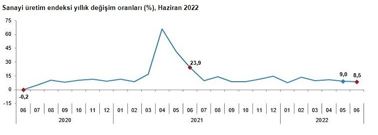 Sanayinin alt sektörleri incelendiğinde, 2022 yılı Haziran ayında madencilik ve taşocakçılığı sektörü endeksi bir önceki yılın aynı ayına göre yüzde 7,1 azalırken, imalat sanayi sektörü endeksi yüzde 10 ve elektrik, gaz, buhar ve iklimlendirme üretimi ve dağıtımı sektörü endeksi yüzde 0,6 arttı.