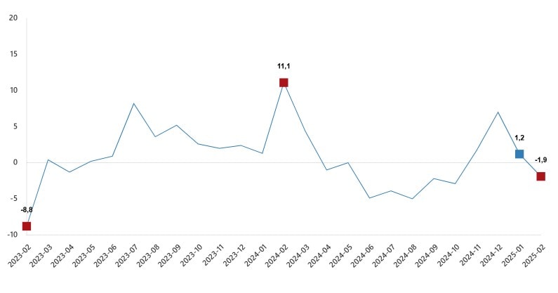 Buna göre sanayinin alt sektörleri (2021=100 referans yıllı) incelendiğinde, 2025 yılı Şubat ayında madencilik ve taş ocakçılığı sektörü endeksi bir önceki yılın aynı ayına göre yüzde 5,8 azaldı, imalat sanayi sektörü endeksi yüzde 2,5 azaldı ve elektrik, gaz, buhar ve iklimlendirme üretimi ve dağıtımı sektörü endeksi yüzde 8,5 arttı.
