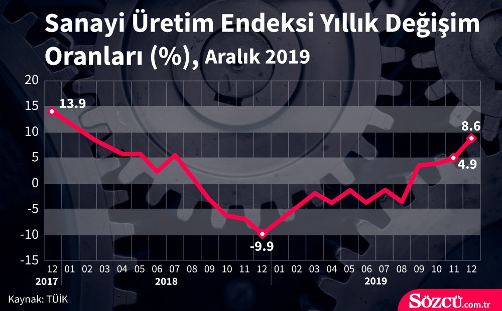 Aralıkta takvim etkisinden arındırılmış yıllık artış, Şubat 2018'deki yüzde 9,5'luk artış sonrasındaki en yüksek rakam oldu.