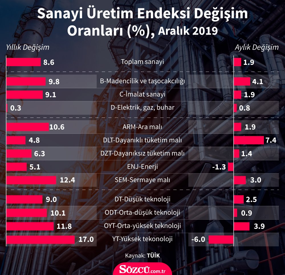 2019'un toplamında ise sanayi üretimi, bir önceki yıla göre yüzde 0,6 oranında azaldı.