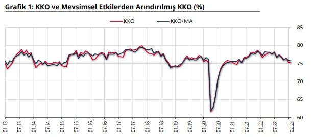Mevsimsel etkilerden arındırılmamış Kapasite Kullanım Oranı (KKO), bir önceki aya göre 0,1 puan azalarak yüzde 75,2 seviyesinde gerçekleşti. Bu oran, Mart 2021 sonrasındaki 23 ayın dibi olarak kayıtlara geçti.