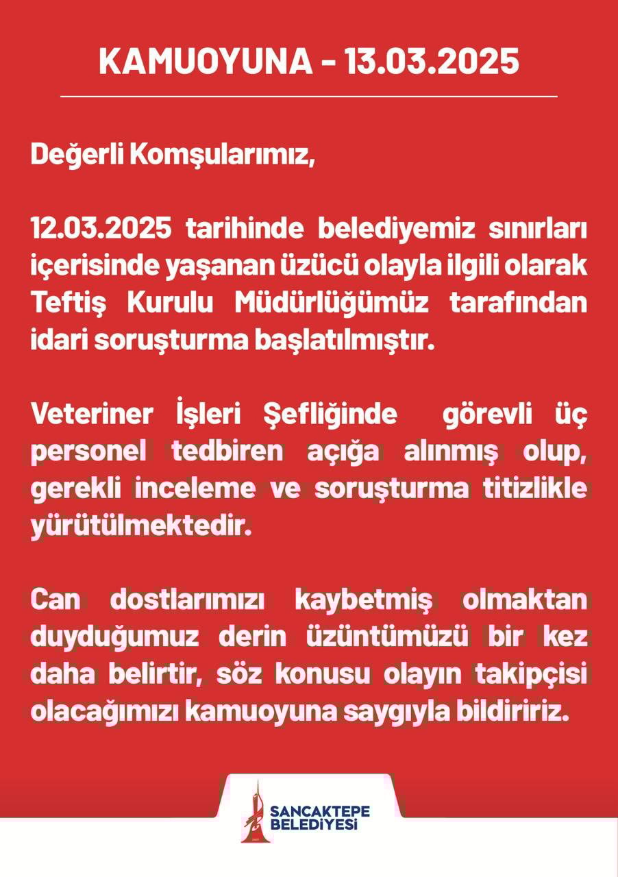 Başkan Yeğin, 12 Mart 2025 tarihinde belediye sınırlarında yaşanan olayla ilgili olarak Teftiş Kurulu Müdürlüğü tarafından idari soruşturma başlatıldığını duyurdu. Yeğin, Veteriner İşleri Şefliğinde görevli üç personelin tedbiren açığa alındığını belirterek, "Gerekli inceleme ve soruşturma titizlikle yürütülmektedir" ifadelerini kullandı.